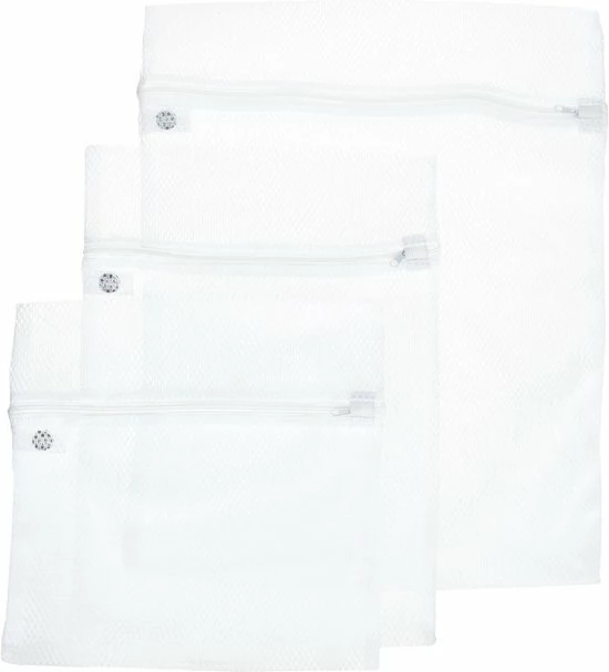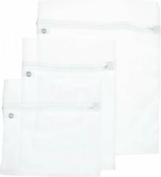 Set van 3x stuks waszakjes/wasnetjes wit in 3 formaten. Deze waszakjes beschermem klein wasgoed, zoals bh’s of panty’s tijdens het wassen en centrifugeren. Voorzien van een rits sluiting. Afmetingen: 30 x 30 cm, 30 x 40 cm en 40 x 50 cm. Materiaal: polyester.
