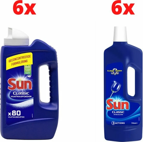 6 x Sun Vaatwaspoeder voor 80 wasbeurten + 6 x Sun Spoelglans 750 ml