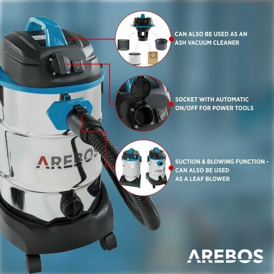 Ervaar optimale reinigingsresultaten in alle omstandigheden. Zijnโฏ5-in-1 functie stelt deze professionele,โฏuitermate krachtige industriรซle stofzuigerโฏin staat elke uitdaging aan te nemen. Of u hem nu als natte of als droge stofzuiger gebruikt, of inzet voor het verwijderen van fijn of grof vuilโฏโ deze multifunctionele stofzuiger van AREBOS zal niets over het hoofd zien. De stofzuiger kan met of zonder stofzak gebruikt worden.