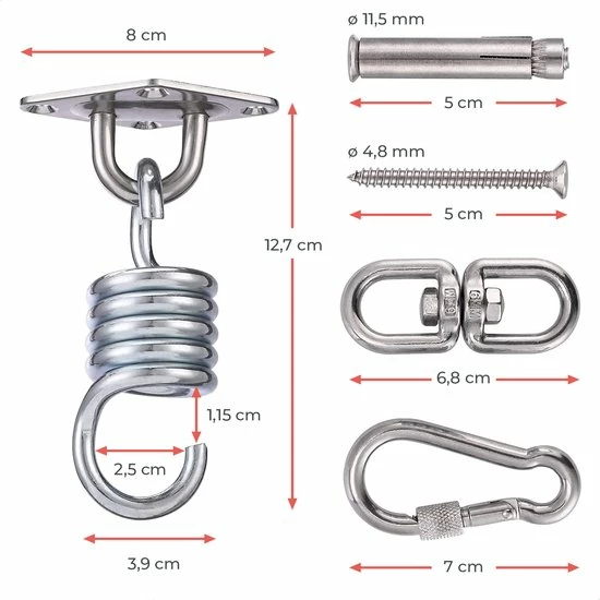 Deze plafondhaak is 360ยฐ vrij draaibaar en ideaal voor het veilig ophangen van een hangstoel of andere roterende dingen. Dankzij een karabijnhaak kun je met gemak verschillende dingen aan een muur of plafond bevestigen. Het 360ยฐ vrij draaibare ophangsysteem met veer en karabijnhaak heeft een draagvermogen van maximaal 200 kg.
