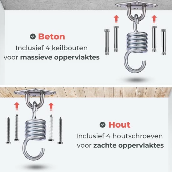 Je hebt geen extra materialen nodig voor het ophangen van de plafondhaak. Deze ophangbeugel wordt met 4 keilbouten (beton pluggen en bouten) en 4 houtschroeven geleverd om deze direct aan een betonnen of houten constructie te bevestigen.