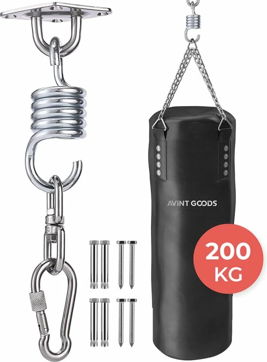 Zoek je een heavy duty plafondplaat of muurbeugel met karabijnhaak voor het veilig ophangen van een bokszak, TRX suspension trainer, turnringen, aerial yoga doek, hangmat, schommel of hangstoel? AVINT GOODS ophangsysteem kan makkelijk tot 200 kg dragen en is voorzien van een bokszak veer om geluid te dempen en klappen te ontvangen.