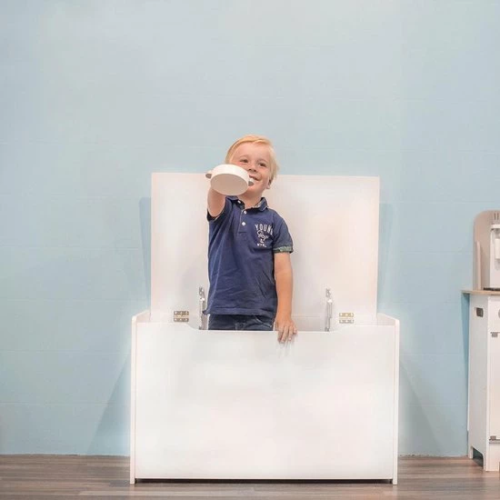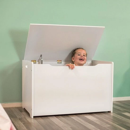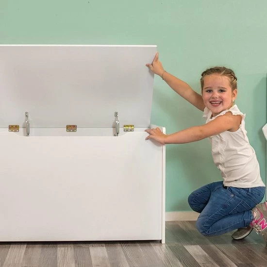 Witte speelgoedkist en opbergkist XL van het merk Bandits & Angels. Ruime kist met een formaat van 80 x 50 x 50 cm. Voorzien van een gasveer waardoor de klep langzaam sluit en niet dicht kan klappen.