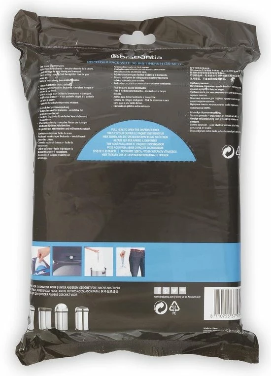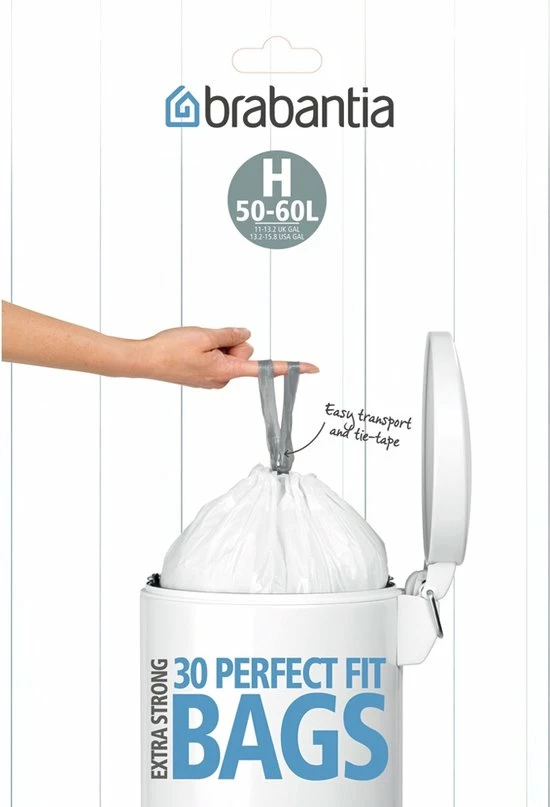 Voor elke bak een passende zak met de Brabantia PerfectFit Vuilniszakken – 50/60 l – Code H – 30 stuks. De perfect passende afvalzakken voor Brabantia pedaalemmers, prullenbakken, afvalemmers, Touch Bins etc. De dispenser pack werkt als een tissueverpakking. Je pakt een nieuwe afvalzak beet en trekt hem er zo uit; de afvalzakken zitten niet aan elkaar vast, zoals bij de meeste afvalzakken op een rol.