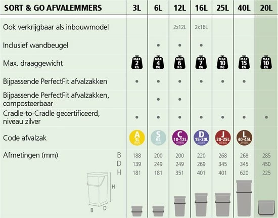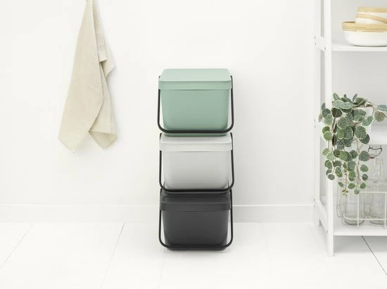 Geef je lege flessen, blik, plastic of wat je verder maar kwijt wilt aan de Sort & Go afvalemmers. Ze passen in elke hoek en tegen de muur. Met het grote handvat draag en leeg je ze met gemak. De Sort & Go collectie bestaat uit afvalemmers van 3, 6, 12, 16, 2×12, 2×16, 20, 25 en 40 liter in Fir Green, Mint, White, Light Grey, Grey & Jade Green.