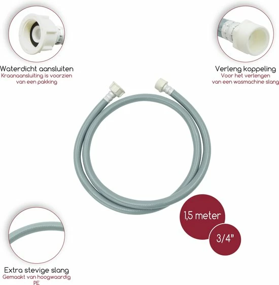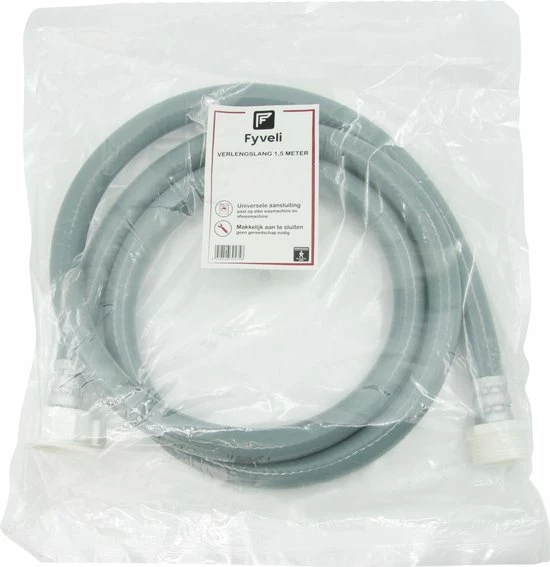 Wasmachine toevoerslang te kort? De Fyveli aanvoerslang verlengslang is uitermate geschikt voor het verlengen van een huidige aanvoerslang. Deze verlengslang is robuust en 1,5 meter lang en kan een watertemperatuur tot 92 graden Celsius aan. De slang kan een werkdruk aan tot wel 20 bar met een barst druk van 50 bar, wat ervoor zorgt dat deze gemakkelijk veilig aangesloten kan worden omdat de waterleiding druk in een woning tussen de 2 en 3 bar ligt. Verder is de slang gemakkelijk waterdicht aan te sluiten op het waterpunt door de ΒΎβ wartelaansluiting inclusief meegeleverde rubberen pakking. Het andere uiteinde bevat ΒΎβ schroefdraad, waardoor een andere toevoerslang hier gemakkelijk op aangesloten kan worden.