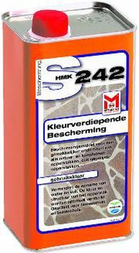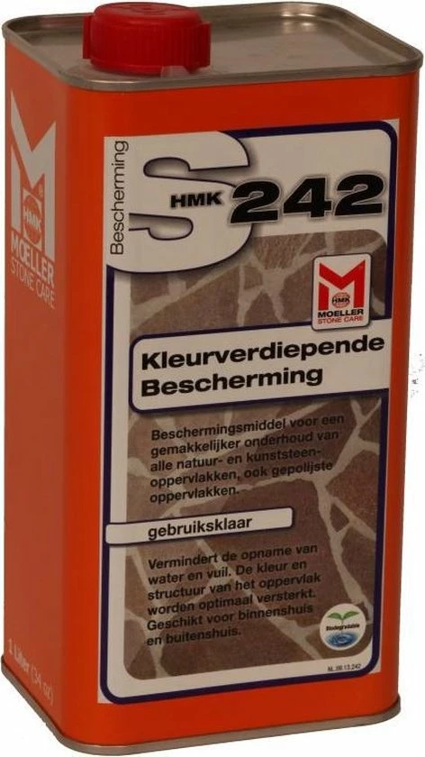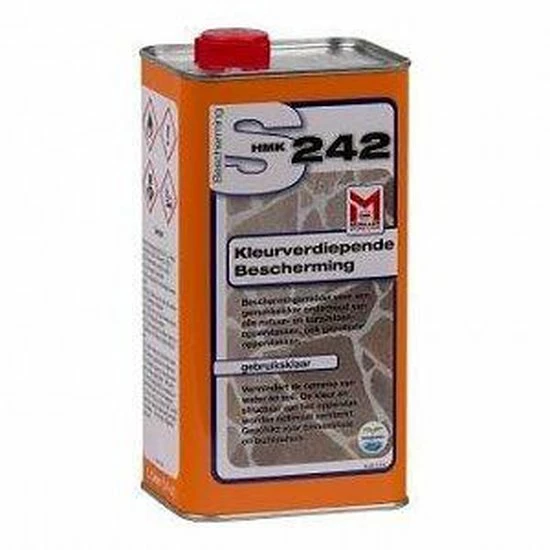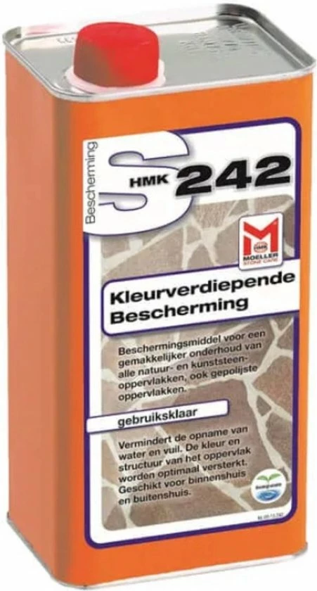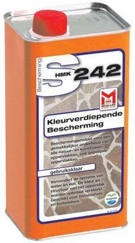 HMK S242 Kleurverdiepende bescherming is een speciaal impregneermiddel welke gebruiksklaar is. Door het impregneren met de S242 wordt binnendringen van water en vuil voorkomen bij natuurstenen oppervlakken, marmercompisiet, kunststeen en terrazzo binnens- of buitenshuis. Ook zeer geschikt voor gepolijste oppervlakken. Met de HMK S242 Kleurverdiepende bescherming wordt de kleur en structuur van het oppervlak optimaal benadrukt.