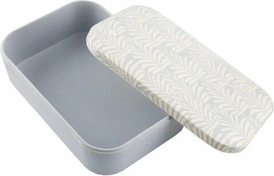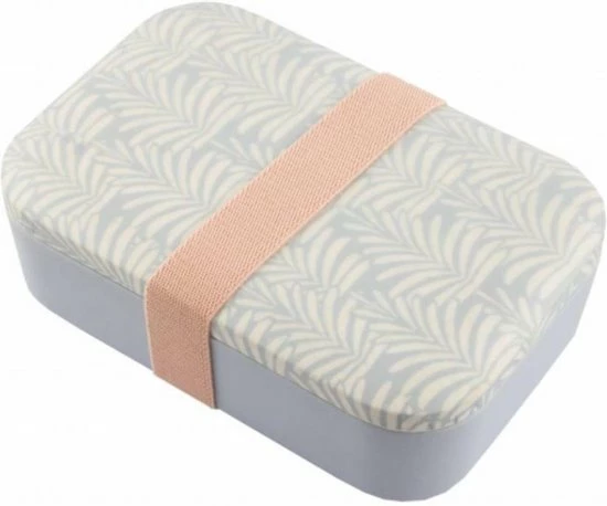 Deze goede kwaliteit lunchbox is gemaakt van 100% bamboe. De lunchbox heeft een matgrijze/blauwe uitstraling. Dankzij de roze elastische band weet je zeker dat de inhoud goed bewaard blijft.
