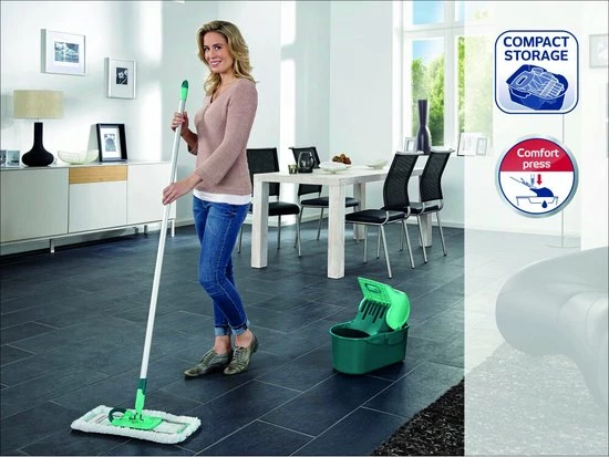 De Profi Compact Pers van Leifheit is ideaal voor reinigen zonder te bukken en zonder de handen in vuil water nat te maken. De uitwringpers Profi compact bestaat uit een emmer met 8 liter inhoud en een persopzetstuk, welke manueel te bedienen is. Via de hefboombeweging wordt de vloerwisser met de hand uitgewrongen. Neemt weinig plaats in beslag, omdat het persopzetstuk in de emmer kan worden bewaard. 3 jaar garantie.