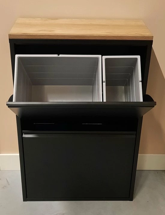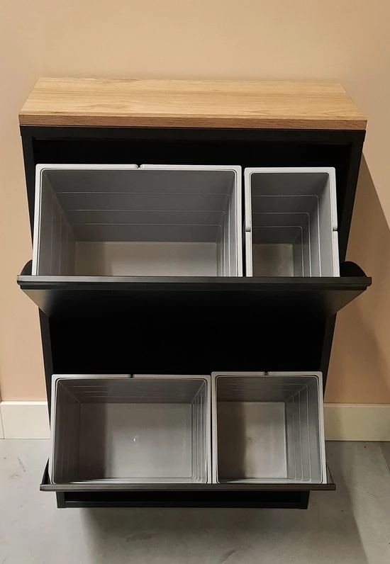 Afvalbak met vier verschillende maten binnenemmers zwart, afgewerkt met een massief eiken paneel.