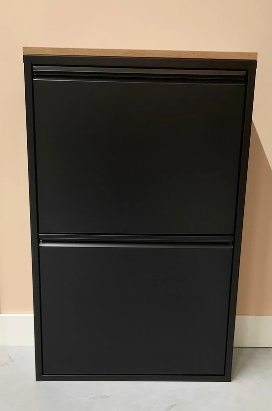 Het strakke design maakt dat deze vuilnisbak met 4 binnenemmers meer op een kastje lijkt dan op een afvalbak. Kies je favoriet uit de beschikbare kleuren zwart, metallic grijs of wit voor een mooie blikvanger in je keuken. De afvalemmer is afgewerkt met een massief Eiken paneel wat invisible is afgelakt. Dus het prachtige hout is beschermd. Omdat het een natuurproduct is, is ieder paneel uniek.
