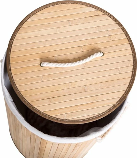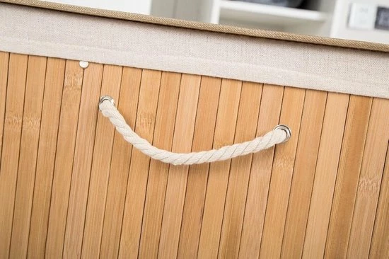Voorzien van afsluitbare bamboe deksel. De wasmand is tevens eenvoudig te verplaatsen dankzij de twee handvatten aan de zijkanten.