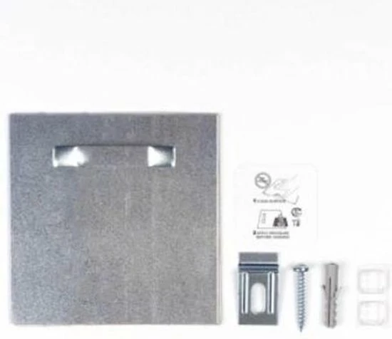 Deze ophangplaat wordt compleet geleverd inclusief plug, schroef, reinigingsdoekje, siliconen- plaat afstandhouders en instructies.
