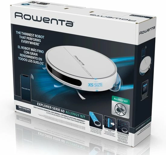 De Rowenta Smart Force X-Plorer Serie | 60 Wet & Dry Allergy Kit RR7447WH – Robotstofzuiger maakt je huis schoon zonder zelf ook maar iets te hoeven doen. De Rowenta Serie | 60 robotstofzuiger is de dunste 4-in-1 robotstofzuiger* op de markt met een hoogte van slechts 6 cm waardoor hij zelfs onder laag meubilair door kan om verborgen stof op te zuigen. De Turbo Brush, een gemotoriseerde borstel in het midden, verwijderd stof en vuil met gemak.Sla twee vliegen in één klap met het Aqua Force-systeem, dat je vloer dweilt tijdens het stofzuigen, voor zichtbaar perfecte resultaten! Het navigatiesysteem Smart Exploration 4.0 garandeert dat de delen van je huis die door de stofzuiger gereinigd moeten worden, ook echt op nauwkeurige wijze worden aangepakt. Daarnaast is hij zeer gebruiksvriendelijk en eenvoudig te gebruiken: maak verbinding met de app en bedien hem van afstand, waar je ook bent. Tevens is deze robotstofzuiger compatibel met verschillende spraakbesturingssystemen.