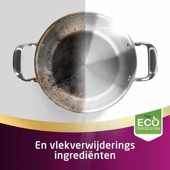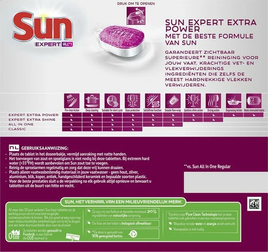 Al meer dan 60 jaar verbetert Sun haar tabletten en de werking ervan om tot onze best mogelijke vaatwasresultaten te komen. Sun zet zich constant in om het impact op het milieu te verminderen, zonder afbreuk te doen aan de reinigingskracht. De tabletten worden gemaakt in een fabriek in Frankrijk die CO2-neutraal is. Ze zijn fosfaatvrij en bevatten minimaal 30% ingrediΓ«nten van natuurlijke oorsprong. De tabletfolie is biologisch afbreekbaar en hoef je dus niet te verwijderen voor het de machine in gaat, maar vermijd aanraking met natte handen. De oplosbare tabletfolie zit nu nog strakker om de tabletten heen, waardoor de verpakking kleiner is. Daarbij komt dat de doos gemaakt is van gerecycled karton en de binnenste plastic zak is verwijderd om plastic afval te verminderen. De verpakking is gemakkelijker te recyclen, dankzij de “easy-flattening” optie en is 100% recyclebaar.