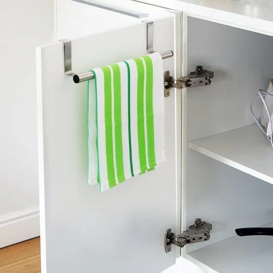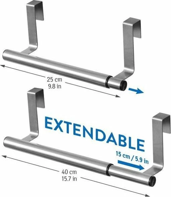 Met deze handige verstelbare handdoekhouder heb je altijd plek voor je handdoeken of theedoeken. Handig voor in de keuken, badkamer en zelfs voor op het toilet. Het rek is makkelijk te verstellen, waardoor het past op verschillende maten kastdeuren. Het rek hoef je niet te monteren, maar hang je eenvoudig aan de kastdeur. Dus geen vervelende gaten in de muur. Bovendien is het rek voorzien van een anti-slip strip waardoor het rek niet verschuift en er geen krassen kunnen ontstaan. Dankzij het roestvrij staal gaat het rek lang mee en geeft het materiaal niet af op de handdoeken.